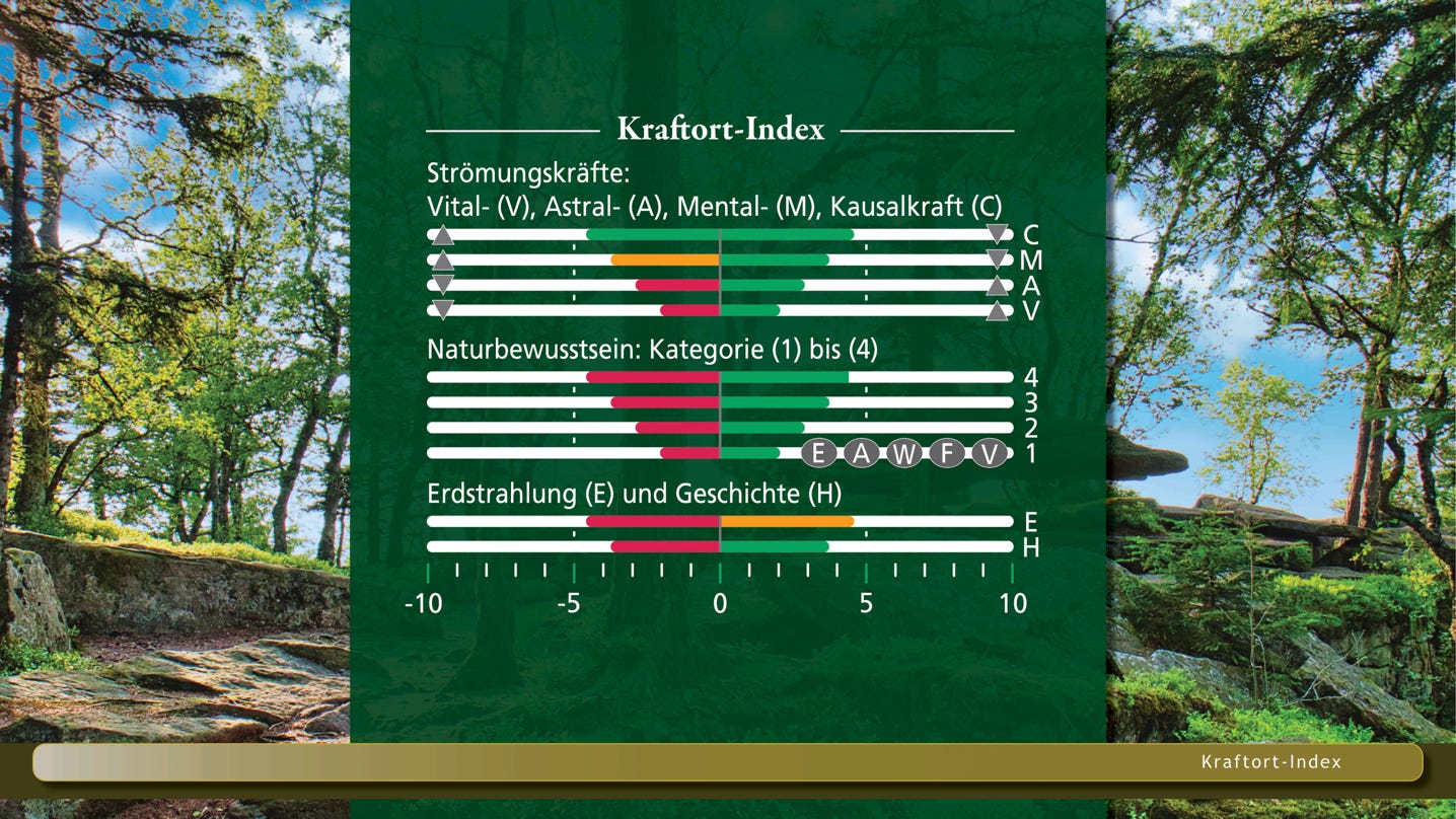 Um Kraftorte qualitativ beschreiben zu können habe ich den Kraftort-Index entwickelt. Zusammengenommen beobachte ich drei Kräfte-Kategorien in der Natur: die Strömungskräfte, die Strahlungskräfte und alles was wesenhaft ist beziehungsweise Bewusstsein hat. Jede Kategorie ist mit einer Gruppe waagerechter Balken dargestellt, auf der eine Intensität von minus Zehn bis plus Zehn angegeben werden kann. Landschaftskräfte können also maximal eine Intensität von plus Zehn haben. Die Intensität kann nach eigenen Erfahrungen von Kraftorten individuell eingeschätzt werden.